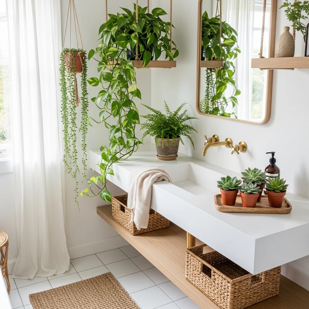 Varieties such as ferns or succulents thrive well in humid conditions and will elevate the overall decor — small pots on shelves or hanging plants add a contemporary touch and can enhance air quality, contributing to a more refreshing atmosphere. But the garden inspired bathroom decor direction in 2026 goes further than a single succulent on the windowsill. Think lush and layered — a large trailing pothos cascading from a high shelf, a small fern in a terracotta pot on the vanity, a cluster of succulents in varying sizes on a wooden board beside the sink, and a trailing string of pearls plant hanging from a small ceiling hook near the window.